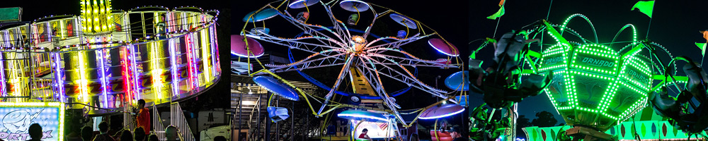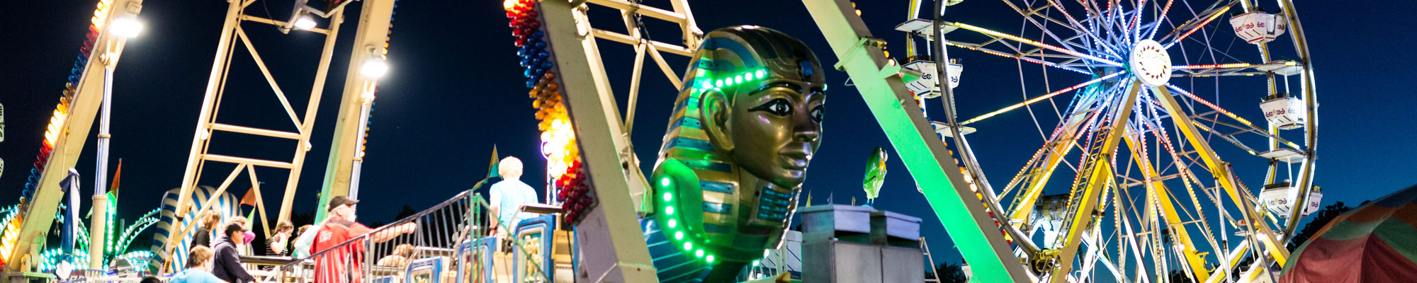 The focal point of the Thomas Carnival midway is the towering Century Wheel, a 70 foot Ferris wheel with gondola-style seating—providing in-the-cloud enjoyment for guests ranging from family units to brand new friends attending their first fair together (the Century Wheel is Thomas Carnival's most popular ride.) The Chance Rides Thunderbolt boasts alternating red and blue cars circling a center point that pivot outward-- by centrifugal force. Passengers end up sideways! And the mighty Pharaoh’s Fury—it appears to be an ocean vessel with an artistic Egyptian Pharaoh’s head sculpture (one on each end). Swinging in an arc 54 feet high, the Pharaoh’s Fury takes passengers from horizontal to vertical. You’ll witness scores of passengers thrill to the momentary weightless effect as the boat rises high, reverses motion, then plunges. One cool ride.